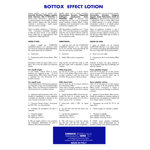 - Specific lotion rich in active principles, (Ceramides, Keratin, Vegetable Collagen, Hyaluronic Acid, Pistachio Oli) it restores and reinvigorates the hair with a synergistic action creating a bottox effect: it gives brightness and nourishment to hair stalk and the hair appears rich