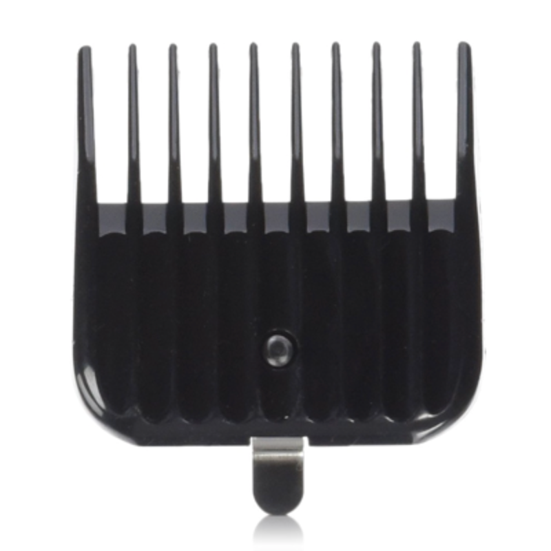 - Black plastic comb with spring metal clip to hold comb on to blade