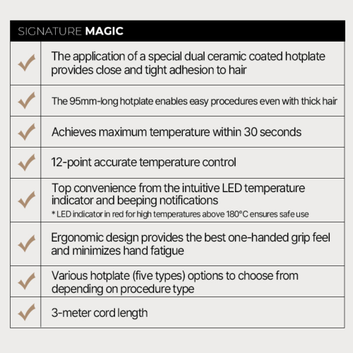 - The application of a special dual ceramic coated hotplate provides close and tight adhesion to hair