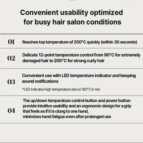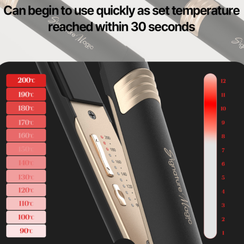 - Delicate 12-point temperature control from 90°C for extremely damaged hair to 200°C for strong curly hair