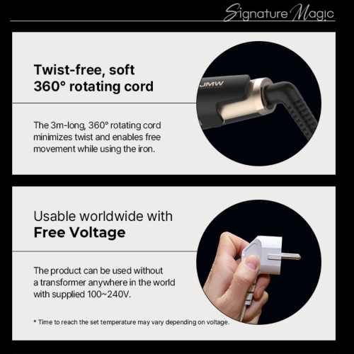 - The 3m-long, 360° rotating cord minimizes twist and enables free movement while using the iron